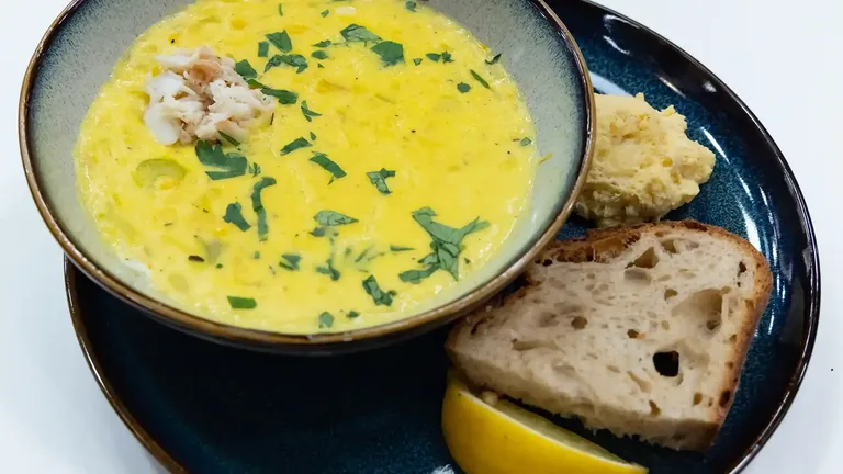 Soup and StewCrab and Saffron Chowder with Cornbread Drop Biscuits