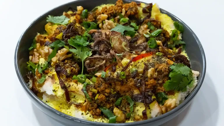 In a braiser pan or pot, sauté remaining garlic and onion until translucent. Add toasted ground sweet rice, peanut butter, and ground peanuts. Stir.